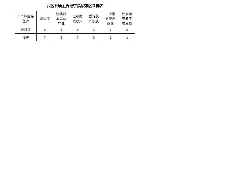 三、主要经济指标郊区县比较通过郊区县比较,我区各项主要经济指标增速的排位与1季度相比一降二升二平,其中规模以上工业产值增速下滑1位,区级财政收入和固定资产投资增速在末位的基础上位次有所提升,此外,增加值和社会消费品零售总额的增速排名保持不变。