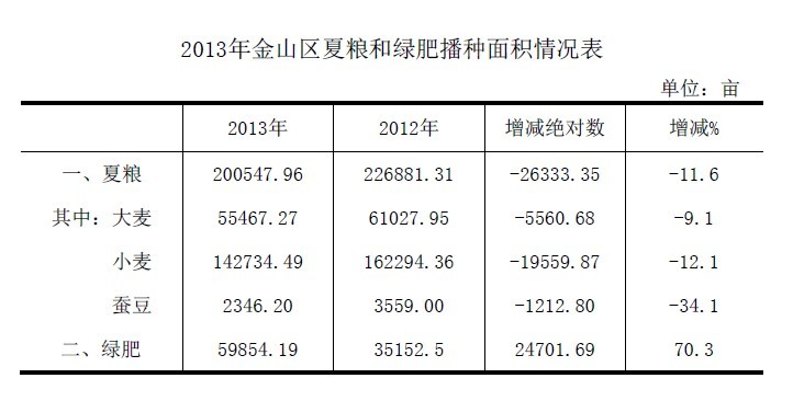 2013年金山区夏粮播种面积为20.05万亩,同比下降11.6%。小麦种植面积为14.27万亩,同比下降12.1%。绿肥种植面积为59854.19亩,比去年增加24701.69亩,同比上升70.3%。(详见下表)