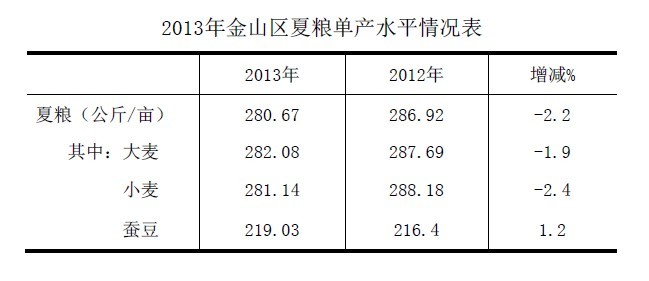 金山区统计局 2013-07-21据全区9个粮食抽样测产点数据显示,上半年金山区夏粮生产呈现“播种面积减少、单产有所回落但仍处于中位水平,总产量下降”的态势。