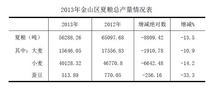 为了进一步优化夏熟茬口,培肥地力,改善土壤质量。自去年以来,市、区两级相继出台了有关政策,进一步加大对绿肥种植补贴力度,极大提高了农户绿肥种植的积极性,农户种植意向改变。2013年,金山区绿肥种植面积为59854.19亩,比去年增加了24701.69亩,同比上升70.3%。绿肥种植面积大幅增加,夏粮种植面积减少,总产量下降明显。