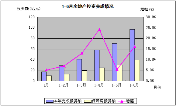 月,房地产完成开发投资96.9亿元,同比增长16.2%。从趋势来看,4月投资增幅达到半年来的最高点,为24.2%。从投资排名前五位的项目来看,保障房项目占了其中4个名额。6月投资增幅达到上半年投资的第二个高点,主要由于土地购置费的带动,土地购置费同比增幅达到3.9倍。从土地费排名前五位的项目来看,保障房项目占了其中3个名额。
