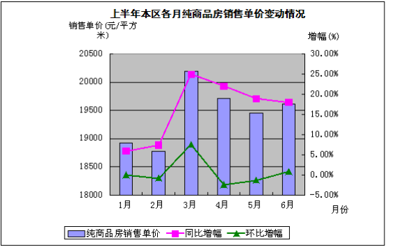 保障性用房销售增加,对商品房销售单价有一定影响。剔除保障房因素,一季度纯商品房销售单价为20196元/平方米,同比增长24.9%,达到上半年纯商品房销售均价的最高点,主要原因在于受“国五条”政策出台影响,销售市场出现了快速的回暖迹象,也给开发商预留了提高房屋均价的空间所致。4月份纯商品房销售均价为19707元/平方米,同比增长22.0%,环比下降2.4%;5月份纯商品房销售均价为19455元/平方米,同比增长22.0%,环比下降1.3%;6月纯商品房销售单价为19613元/平方米,同比增长18.0%,环比增长0.8%。6月环比出现正增长的主要原因在于宝山工业园区新开盘项目的推动。总体来说,商品房的销售处在平稳波动的状态。