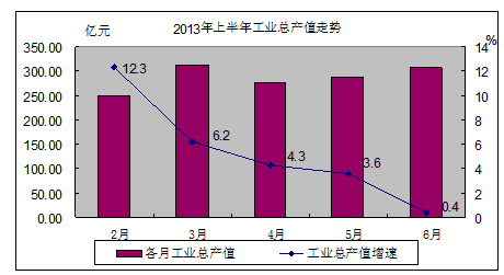 从各月生产运行态势看,累计产值增速虽保持增长,但呈逐月回落趋势。从各月看,2月虽产值总量较低,但因季节因素原因,其产值增速达12.3%,是上半年的最高增速;3月生产形势较好,产值总量突破300亿元,累计产值增速为6.2%;4月、5月产值总量略有回落,但累计增速仍在4%左右,6月产值总量为306.41亿元,但由于去年同期数的同步抬高,累计产值增速仅为0.4%,环比1-5月份增速回落了3.2个百分点,较1-2月份增速大幅回落了11.9个百分点。