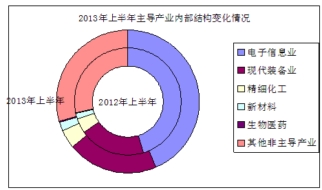 同时,主导产业内部结构有序调整。上半年,电子信息业实现产值759.67亿元,占全区产值的比重由上年同期的45.2%下降到43.7%,同比下降了1.5个百分点;精细化工比重同比下降0.1个百分点;而其他三大产业地位相对上升,其中现代装备业实现产值354.9亿元,占全区产值的比重由上年同期的20.2%提高到20.4%,同比上升了0.2个百分点,在近2年装备业不景气的市场条件下,已属不易;新材料比重同比提高了0.2个百分点,生物医药同比提高了0.1个百分点。可见,五大主导产业内部结构不断向合理化调整。