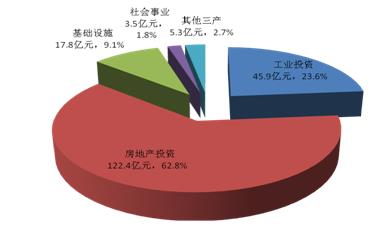 从三次产业投资来看,2013年1-6月,全区第一产业未发生固定资产投资;第二产业完成固定资产投资45.9亿元,同比增长1.4%,占全部投资的23.6%;第三产业完成固定资产投资149.0亿元,同比增长12.6%,占全部投资的76.4%。