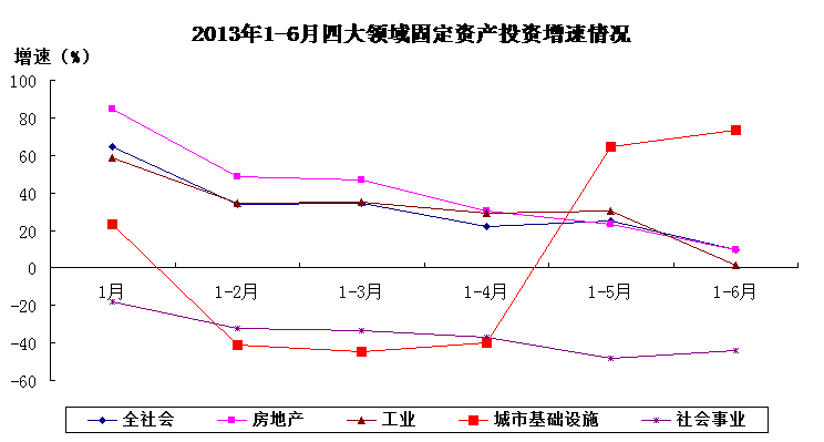 综上所述,2013年1-6月份固定资产投资在房地产投资、基础设施投资增长的带动下,投资总量实现一定幅度的增长。从前6个月的情况来看,全年固定资产投资将会超目标完成全年计划。