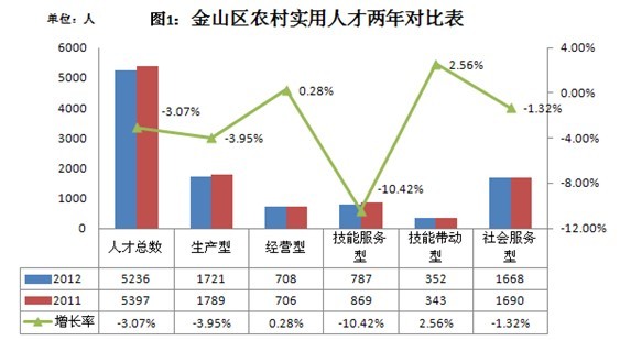 本次调查涉及金山区9镇1工业区,124个行政村。2012年末2,本区拥有本市户籍农村人口319635人,劳动力205716人,村民小组2326个,农户98827户。拥有农村实用人才5236人,比2011年度减少161人,下降3.07%(详见图1)。其中生产型人才1721人,经营型人才708人,技能服务型人才787人,技能带动型人才352人,社会服务型人才1668人。