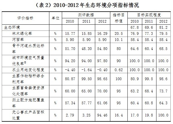 生态环境主要反映自然资源和生态环境的状况和可利用程度,今年较去年减少了一个指标,现设置9项基础指标,包括绿化、水、空气、农田以及生态农业等指标。2012年金山区生态环境目标实现程度为81.2%,比2010年提高13.4个百分点(见表2)。测评结果显示,本区生态环境得到明显改善,林木绿化率持续提升,水环境质量有所好转,城市空气质量稳中趋好,农业生态建设不断加强,生态环境基础进一步夯实。