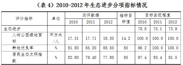 生态进步主要反映社会进步使人们对生态环境重要性有更高的认识,共设置5个指标,包括人均公园绿地面积、饮用水源地水质达标率、耕地优良率、公众对环境保护满意度、居民生态文明指数等。2012年,金山区生态进步目标实现程度为73.9%,比2010年下降4.9个百分点(见表4)。测评结果显示,我区公园绿地的生态服务功能日趋显现,土壤基础地力保持稳定。