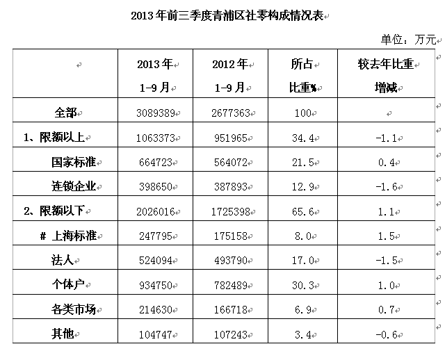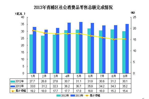 青浦区统计局 2013-10-28前三季度青浦区商业经济运行总体平稳,城镇市场商品供应充盈,品种丰富,城乡市场繁荣活跃,居民消费能力随着节日的到来进一步增强,销售持续稳步增长。前三季全区社会消费品零售总额突破300亿元,完成308.9亿元,比去年同期增加41.2亿元,同比增长15.4%。