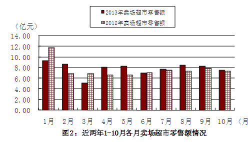 从分月运行情况来看,1月份由于受去年同期是春节月,基数较大的影响,零售额下降明显。2月份开始受春节假日影响,增幅有所回升。接下来是4月的传统淡季、5月的长假效应,进入后半年,连锁超市零售额逐步回升趋于稳定。