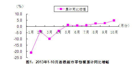 全区连锁超市共有387家门店,今年的销售业绩呈现“先低后高、基本为负、终趋平稳”的运行特点(见图1)。如图所示,5月起开始增长,10月止,连锁超市零售额同比增长4.8%,扣除新增企业因素,增长1.4%。