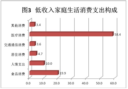 调查显示,上半年低收入家庭人均生活消费支出为6090元,扣除医疗保险报销1044元为5046元。其中,医疗消费3989元,剔除报销医疗费后为2945元,占58.4%;食品消费为1002元,占19.9%;居住消费为235元,占4.7%;交通通信消费为184元,占3.6%;人情消费为507元,占10.0%;其他消费173元,占3.4%。医疗消费比重较高,占到总消费支出近六成,许多家庭都不堪重负。调查显示,有30.5%的家庭有借款,47.5%的家庭借款在2万元以上,借款的用途75.4%是用于看病, 其他用于子女上学、人情支出、建购房屋等。与去年相比,今年低收入家庭的医疗费用支出情况,有16.5%家庭表示明显增加,有20.0%表示略有增加,42.0%表示基本持平。当问及调查户是否存在因经济原因而有病不医时,1.0%的家庭表示“有,因此彻底放弃治疗”;19.5%的家庭表示“有,因此放弃部分治疗”;38.0%的家庭表示“勉强维持治疗”。