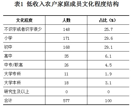 2.低收入家庭成员的文化程度偏低,8成以上文化程度在初中及以下。在低收入农民家庭成员中,文化程度相对较低,高学历人员微乎其微,研究生及以上学历没有。调查显示,不识字或者识字很少的有148人,占25.7%;小学文化程度有171人,占29.6%;初中文化程度有168人,占29.1%;高中文化程度有35人,占6.1%;中专/高职文化程度有26人,占4.5%;大学专科文化程度有11人,占1.9%;大学本科文化程度有18人,占3.1%(见表1)。目前低收入农民家庭成员中,八成以上成员文化程度在初中及以下。