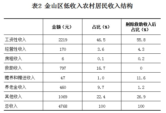 2.总收入只有全区可支配收入的一半,救助收入近两成。调查资料显示,上半年低收入农村家庭人均总收入为4768元,未到本区上半年农村居民人均可支配收入的一半。其中,工资性收入为2219元,占46.5%;经营性收入为170元,占3.6%;房租收入为6元,占0.1%;救助收入为797元,占16.7%;赡养和赠送收入为47元,占1.0%;养老金收入为460元,占9.6%;其他收入1069元,占22.4%。
