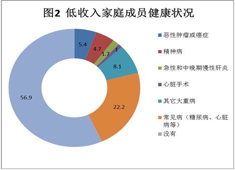 3.低收入家庭成员的健康状况令人担忧,一半以上是重病户。调查显示,在低收入家庭中,有103户患重病,占比51.5%,有72户是残疾户,占36.0%,既是重病户又是残疾户的有45户,占22.5%。在低收入农民家庭成员中,患恶性肿瘤或癌症有31人,占5.4%;患精神病的有27人,占4.7%;患急性和中晚期慢性肝炎有10人,占1.7%;心脏手术的有6人,占1.0%;患其他重大疾病有47人,占8.1%;患常见病(糖尿病、心脏病等)的有128人,占22.2%;没有患病的有328人,占56.9%(见图2)。总体看,低收入家庭成员中有近一半的成员患病,他们的健康状况令人担忧。