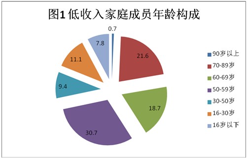 1.低收入家庭成员的年龄普遍较大,50岁以上成员占7成以上。调查显示,在农村居民低收入家庭成员中,16岁以下的有45人,占7.8%;16岁到29岁的有64人,占11.1%;30岁到49岁的有54人,占9.4%;50岁到59岁的有177人,占30.7%;60岁到69岁的有108人,占18.7%;70岁到89岁的有125人,占21.6%;90岁以上有4人,占0.7%。总体显示,50岁以上人员占到低收入农民人数的7成以上,年龄明显老化(见图1)。