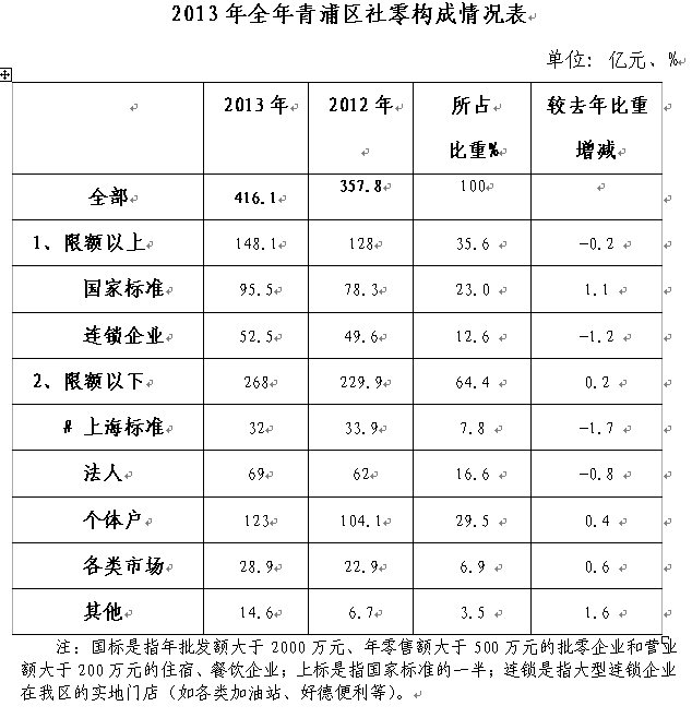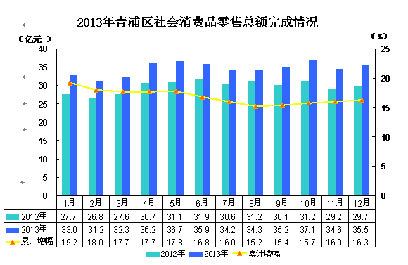 青浦区统计局 2014-01-28随着经济增长模式的转变和国内生活用品需求的扩大,今年我区消费品市场各项指标实现了平稳较快增长。总体而言,商品交易活跃、消费环境优化,城镇市场商圈扩大、货品供应充足;城乡市场繁荣活跃,居民消费能力进一步增强。我区全年社会消费品零售总额达到416.1亿元,比去年同期增加58.3亿元,同比增长16.3%,对全区经济的发展起到重要的拉动作用。