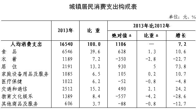 5、交通和通信类支出增长较快。2013年城镇居民人均交通和通信支出为2512元,较去年同期增加490元,增幅24.2%。其中交通类支出为1599元,增幅38.4%。在交通类支出中,交通工具服务支出为404元,比上年同期增加344元,拉动交通类支出增长21.5个百分点。通信类支出为913元,增幅5.4%,主要为购置移动电话支出的增长。