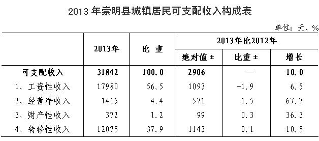 2013年崇明县城镇居民人均可支配收入为31842元,增10.0%,四大块收入齐头并进,经营净收入增势迅猛,工资性收入增长略有放缓。