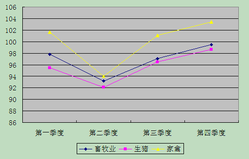 从折线图可以看出,畜牧业方面受生猪和家禽走势影响明显。生猪价格上半年延续去年的走势,继续下跌,于二季度当季指数跌到谷底88.4以后,三季度开始逐步上扬,单季上涨6.1%,四季度继续回升,单季上涨4.6%。家禽产品全年经历了先高后低的走势,4月份禽流感对于家禽产品,特别是水禽影响巨大,但农业部门及时出台了对在防控H7N9禽流感中受到影响的养殖场(户)给予财政补贴的方案。对种禽场、孵化场、家禽养殖场进行财政补贴,对肉鸡和淘汰蛋鸡实行定点保护价收购,肉鸡收购价每公斤不低于9元,淘汰鸡收购价每公斤不低于7元。养殖场的活鸡直接由政府统一采购,因此,尽管关闭了活禽交易,由于这个补贴方案,我区肉鸡生产价格基本没有受到禽流感的影响。下半年随着禽流感的逐渐消退,禽类产品价格逐步回升到正常水平,全年家禽价格小幅上涨3.4%。