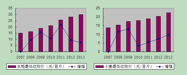 07年以来,粮食最低收购价格逐年上升,而从目前情况来看,2014年预计将继续保持上涨。为保护农民种粮积极性,促进粮食生产,国家继续在小麦主产区实行最低收购价政策,并适当提高2014年最低收购价水平。2014年生产的小麦(三等)最低收购价提高到每50公斤118元,比2013年提高6元。水稻的种植成本在逐年上涨,因此国家为保护农民的利益,稻谷最低保护价也将逐年提高,因此明年稻谷价格总体来看是上涨的态势。