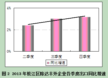 我区出口在2013年同比下降主要受到三项因素影响:从国际来看,外部需求不足导致出口订单减少;从松江来看,历史制约未突破导致对“达丰电脑”和电子信息业的依赖仍明显;从企业来看,生产成本上升导致出口压力加大。