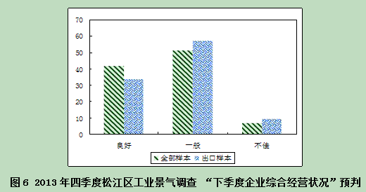 从出口企业经营预期看:以出口业务为主的大中型工业企业中,预计2014年一季度综合经营状况为“良好”的比重仅为33.6%,低于全部调查样本8.1个百分点。相对而言,预计2014年一季度综合经营状况为“一般”或“不佳”的比重分别为57.0%和9.3%,高于全部调查样本5.7和2.4个百分点。