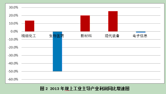 分行业来看,五大主导产业利润总额呈现三升两降,其中,现代装备、新材料、精细化工利润总额分别同比增长为25.5%,20.1%和13.7%,而电子信息业利润总额同比下降1.2%,生物医药受到部分企业投资收益下降的影响,利润总额同比下降50.0%。