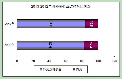 内资企业较快增长。全年内资企业完成工业总产值607.71亿元,同比增长4.7%,较规模以上工业增速高出4.5个百分点,拉动规模以上工业增长0.8%。同时内资企业产值占规模以上工业产值比重为17.4%,比去年提升了1.6个百分点,内资企业地位不断上升,外资企业比重相应下降,企业类型结构不断优化。