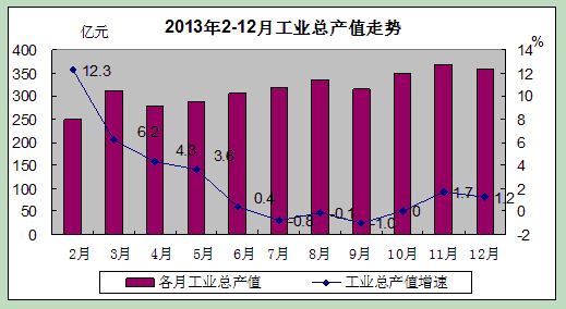 2013年,全区完成工业总产值3795.2亿元,同比增长1.2%。从全年的运行态势看,可以分三个阶段:第一阶段,2-5月产值增速呈逐步下行走势,由年初增长12.3%逐步下降到5月的增长3.6%,下降了8.7个百分点,且单月产值较低,除3月产值为312.25亿元外,其他每月产值都低于300亿元;第二阶段,6-10月工业经济逐步企稳,产值增幅由增长0.4%、跌至9月最低的-1.0%,10月又回升到持平的增速,且单月产值都超过300亿元;第三阶段,11-12月工业产值回归正增长,两月增速分别为1.7%、1.2%,且单月产值超过350亿元。总体上,工业生产上半年逐步企稳、下半年平稳运行。