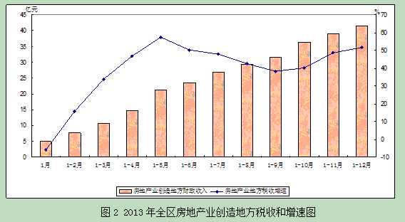 2013年全区房地产业创造地方税收41.54亿元,比上年增长51.6%,较1季度增幅扩大了17.8个百分点。一改2012年房地产业对地方财政贡献为负的局面,今年随着多个地块成交,在良好销售的推动下,房地产业对地方财政的作用日益显著,房地产业对全区地方税收的贡献率为93%,拉动全区地方财政收入增长16个百分点。