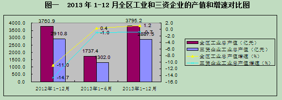 2013年上半年,松江经济增速持续下滑,下半年,经济增速下滑趋缓并开始企稳回升。松江经济结束了上年负增长的局面,全年经济呈现平稳健康发展态势,三资企业也呈现出企稳回升的态势。其中,三资企业的工业总产值增速也由负转正。2012年1-12月,全区工业总产值为3760.9亿元,同比降幅11%,其中三资企业完成工业总产值为2910.8亿元,同比降幅14.7%;2013年1-6月全区工业总产值为3760.9亿元,同比增幅0.4%,其中三资企业完成工业总产值为1302.0亿元,同比降幅1.0%;2013年1-12月,全区工业总产值为1737.4亿元,同比增长1.2%,较去年同期上升12.2个百分点,其中三资企业完成工业总产值为2887.5亿元,同比增长0.7%,较去年同期上升15.4个百分点。在全区经济企稳回升的态势下,三资企业也呈现平稳上升的运行态势。