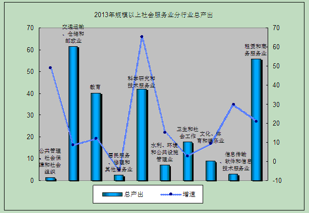 社会服务业的快速发展对于拉动经济增长、扩大就业、推进经济结构调整和产业升级、加快经济经济增长方式转变和改善居民生活质量都将发挥巨大的促进作用。2013年,松江区规模以上社会服务业总产出持续增长,发展规模不断壮大,经济效益日趋向好,呈现出较快的发展态势。