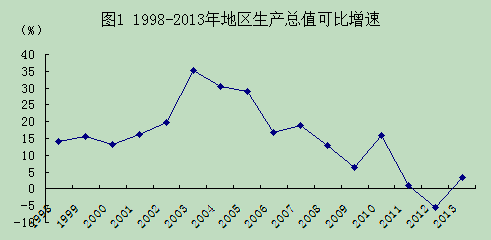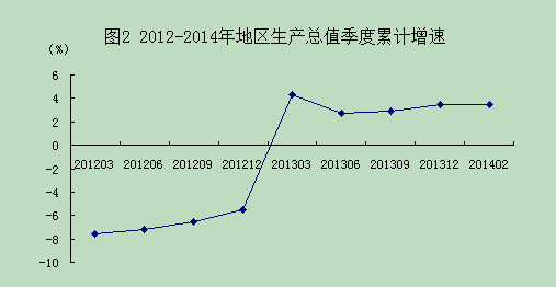 2、从经济走出低谷的短期轨迹看,经济由负转正、企稳回升,今年开局经济增速最宜是稳字当先。2012年全区生产总值由年初的下降15.1%至年末下降5.5%,虽降幅不断收窄,但全年仍为负增长。2013年,全区生产总值开局实现5.4%的增幅,经济增速实现由负转正,并不断企稳回升,全年实现3.5%的平稳增长速度。今年1-2月,全区开局实现3.5%的平稳增速,比较符合和适宜当前的发展趋势。