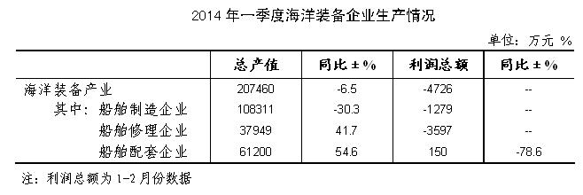 从生产看,一季度全县海洋装备产业累计完成总产值20.7亿元,同比下降6.5%,降幅较全县水平高2.1个百分点。产业内部呈现两增一减态势,其中江南造船集团下属两家船舶制造企业外销订单数量减少、生产形势较为严峻,共计完成总产值10.8亿元,同比下降30.3%。中海长兴、华润大东两家船舶修理企业,2014年初以来订单接收情况较好,生产销售起底回升,共计完成总产值3.8亿元,同比增长41.7%。船舶配套企业受到上海中船长欣线缆配套有限公司订单较多、产能增长的带动,共计完成总产值6.12亿元,同比增长54.6%。