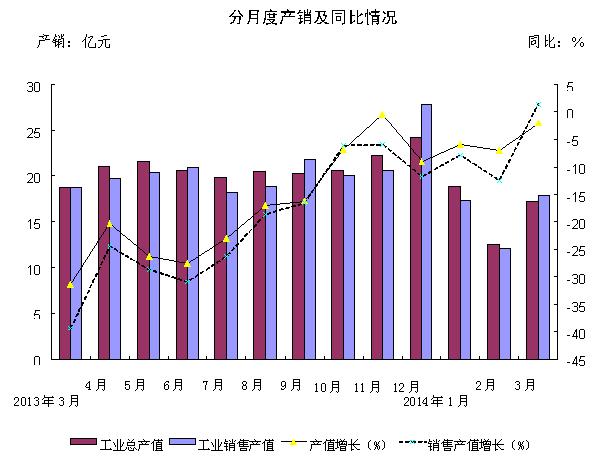 从单月看,3月份全县工业完成总产值17.3亿元,较上月增加4.8亿元,环比增长38.4%;完成销售产值17.9亿元,较上月增加5.8亿元,环比增长47.9%。从累计看,一季度全县工业完成总产值48.7亿元,同比下降4.4%,降幅较上月收窄1.9个百分点;完成销售产值47.6亿元,同比下降6.0%,降幅较上月收窄4.0个百分点。