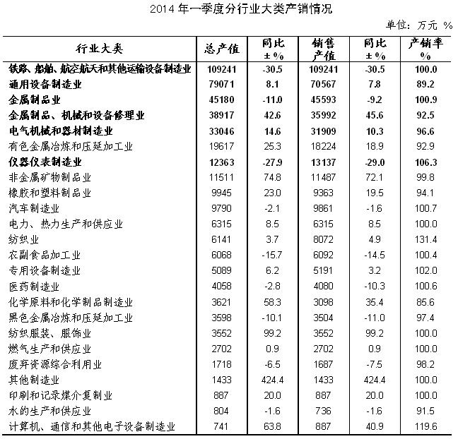 崇明区统计局 2014-04-16一季度,全县工业经济运行平稳,产销同比略有下降。因受近年产业结构调整影响,六大重点行业结构发生改变,纺织业、黑色金属冶炼和压延加工业调出,金属制品机械和设备修理业、仪器仪表制造业调入,企业经营呈现分化形势。
