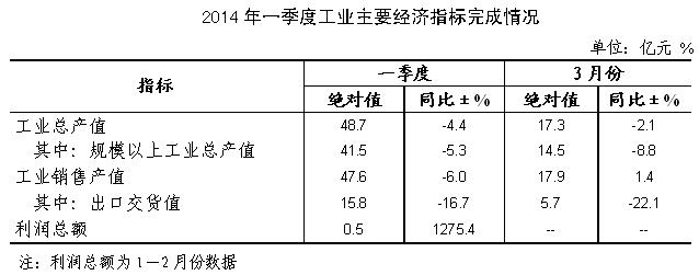 2014年一季度,全县工业经济实现稳健开局,主要经济指标下行趋稳,风险可控。运行状况总体呈现规上降幅趋缓、规下有所增长态势,由于规上经济总量比重较大,规下拉动作用较为有限。预计上半年工业经济形势将继续维持以上态势。