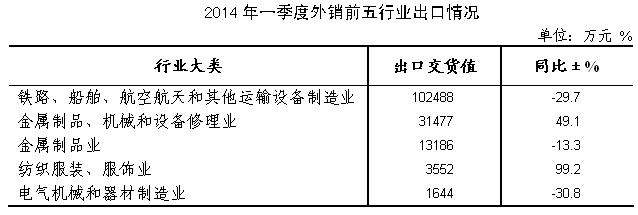 其中,外销排名前五的行业共计完成出口交货值15.2亿元,占全县总数的96.2%;同比下降18.2%,降幅较全县水平高1.5个百分点。外销下降显著主要受到两大因素影响,一是铁路、船舶、航空航天和其他运输设备制造业中的上海江南长兴重工有限责任公司、上海江南长兴造船有限责任公司船舶出口量价齐跌;二是金属制品业中的上海冠华不锈钢制品股份有限公司因春节过后员工到岗率低、人员流失严重,劳动力不足造成开工率偏低,大量订单积压、无法按时完成,因此造成出口交货值减少。