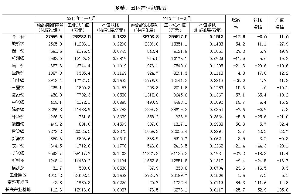 从一季度的规上工业万元产值能耗统计来看,各乡镇、园区间产值能耗差距较大。一是表现在产值能耗降幅上,下降幅度超过全县平均水平的有9个乡镇(园区),降幅最多的港沿镇下降了57.1%;另有8个乡镇(园区)的产值能耗不降反增,增长最多的富盛开发区增长了84.3%。二是表现在万元产值能耗的绝对值上,由于行业和产品结构的差别较大,相应的产值能耗差别也较大,最高与最低相差51倍,其中最低的长兴产业基地只有0.009吨标准煤,最高的港西镇为0.459吨标准煤。(详见附表)