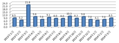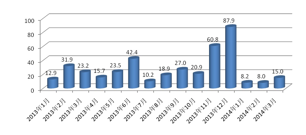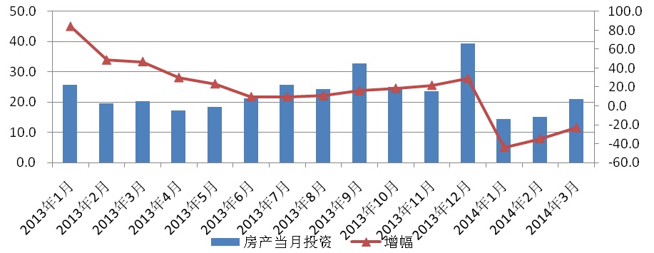 2013年全年及2014年一季度房地产当月投资及累计增长情况