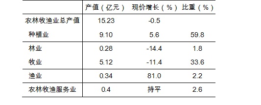 2014年上半年,我区共实现农业总产值15.23亿元,同比微降0.5%。其中:种植业、渔业增长,林业、牧业下降。上半年我区农业经济总量主要以种植业和牧业为主,分别占农业总产值的59.8%和33.6%。