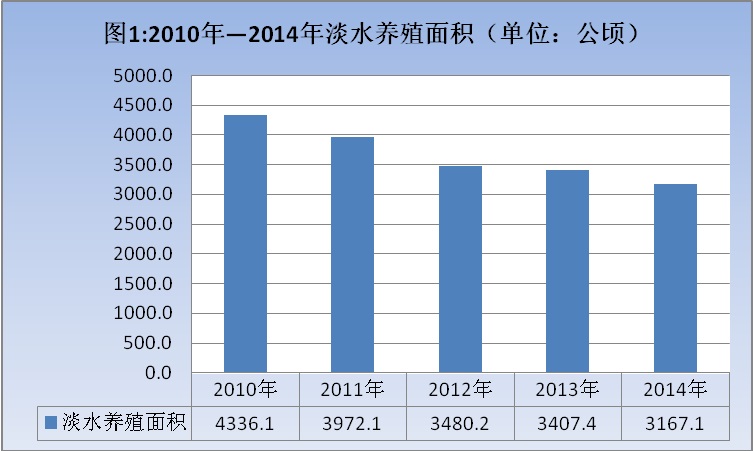 土地复垦导致我区淡水养殖面积逐年下降,如图1所示我区淡水淡水养殖面积从2010年的4336.1公顷下降到今年的3167.1公顷,减少养殖面积1169公顷(约17500亩),下降幅度达27.0%。