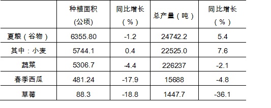 上半年我区夏粮(不含豆类)种植面积6355.80公顷,同比微降1.2%,粮食总产2.47万吨,同比增长5.4%。 产量增长主要得益于小麦单产水平提高,今年我区小麦单产261.4公斤/亩,同比增长 7.2%。