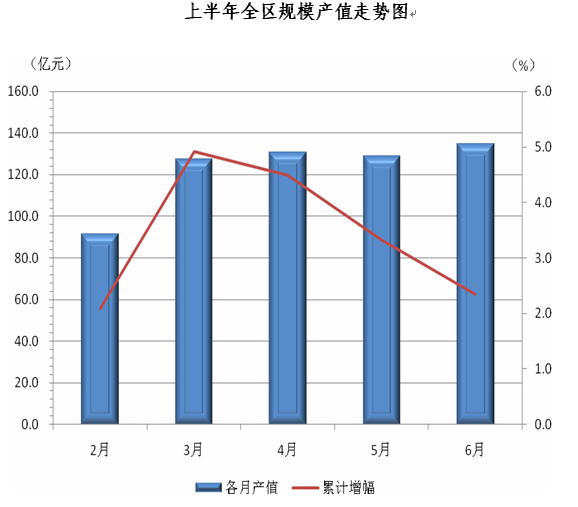 6月份,全区规模工业完成产值134.6亿元,环比增长4.5%,为今年单月产值最高,累计完成产值732.5亿元,比去年同期增长2.3%。从上半年的运行轨迹看,在3月达到年内累计增幅最高后,逐月下探,至6月已低于3月 2.6个百分点,下行趋势明显(见下图)。