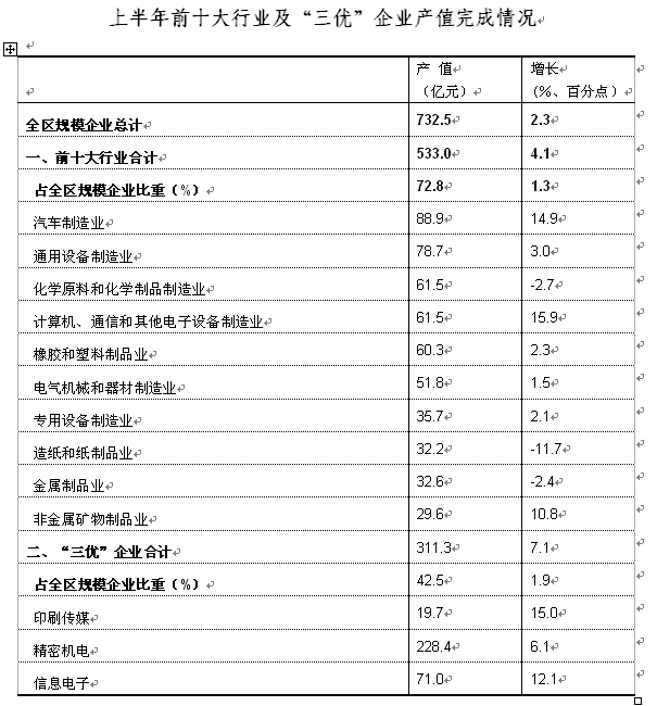 3、主导行业拉动增长,占比结构有所优化。全区前十大行业和“三优”企业实现增长,且占规模工业比重均有提高。上半年,前十大行业完成产值533亿元,比去年同期增长4.1%,拉动全区规模工业增长3个百分点,其中计算机、通信和其他电子设备制造业、汽车制造业和非金属矿物制品业表现突出,增幅位居前三甲,分别达到15.9%、14.9%和10.8%。“三优”企业完成产值311.3亿元,比去年同期增长7.1%,拉动全区规模工业增长2.9个百分点,贡献率达123.3%,其中,印刷传媒和信息电子增长较快,分别比去年同期增长15%和12.1%,精密机电比去年同期增长6.1%。前十大行业和“三优”企业占全区规模工业比重分别达72.8%和42.5%,均比去年同期有所扩大,占比分别提高了1.3个百分点和1.9个百分点(见下表)。