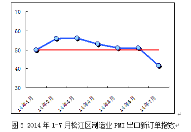 制造业采购经理调查的新出口订单指数对出口运行趋势具有一定的先行预判作用。根据我区该指数在今年前7个月的运行走势,主要能够归纳两方面信息(见图5)。