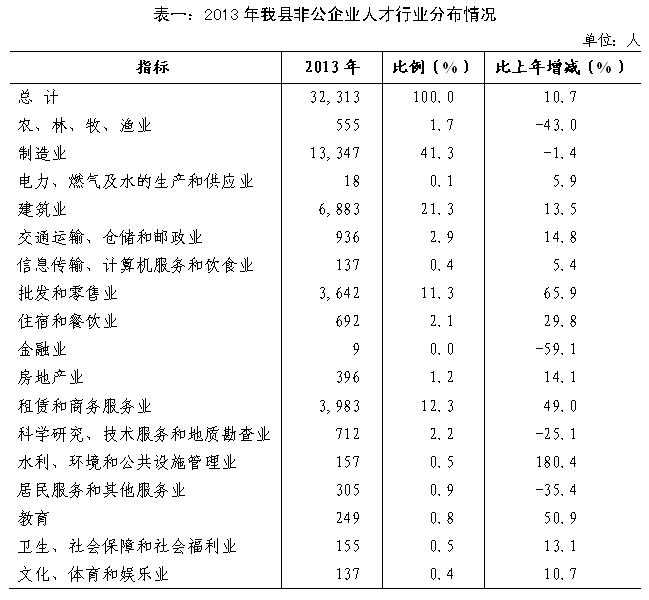 2013年末,我县非公企业人才中,农林牧渔业、金融业、居民服务和其他服务业人才数量下降明显,批发零售业、租赁和商务服务业、教育、住宿餐饮业、水利环境公共设施管理业,人才数量显著上升。(见表1)