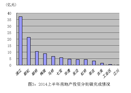 从分街镇投资完成情况看,房地产投资区域分布不均,浦江镇和新虹街道位列第一和第二,分别完成37.35亿元和21.40亿元,合计投资额占全区总量过半。其中,浦江镇以住宅投资为主,完成投资23.41亿元,占其房地产投资比重62.7%;由于虹桥商务区投资的拉动,新虹街镇则以办公楼和商业营业用房投资为主,完成投资15.80亿元,占其房地产投资比重73.8%(见图3)。